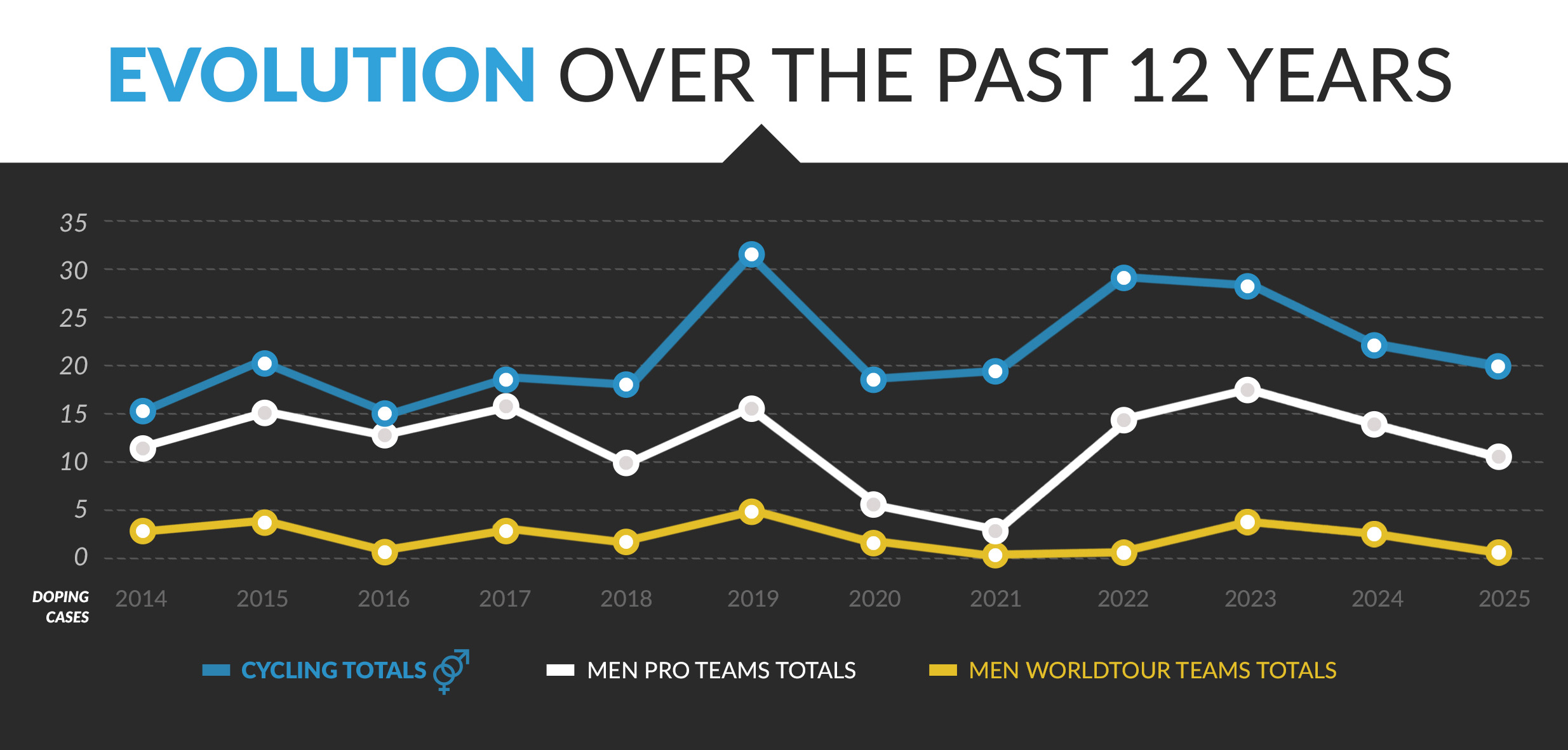 Providing an overview of the fight against doping around the world and in most sports, the Credibility Figures offer a snapshot in which cycling appears to be a model student after having been considered a weak link for many years. Over the course of 2025, 20 cases of doping were recorded among professional cyclists. This figure indicates that the number of cases revealed has been on a downward trend since 2022, when 29 cases were made public.