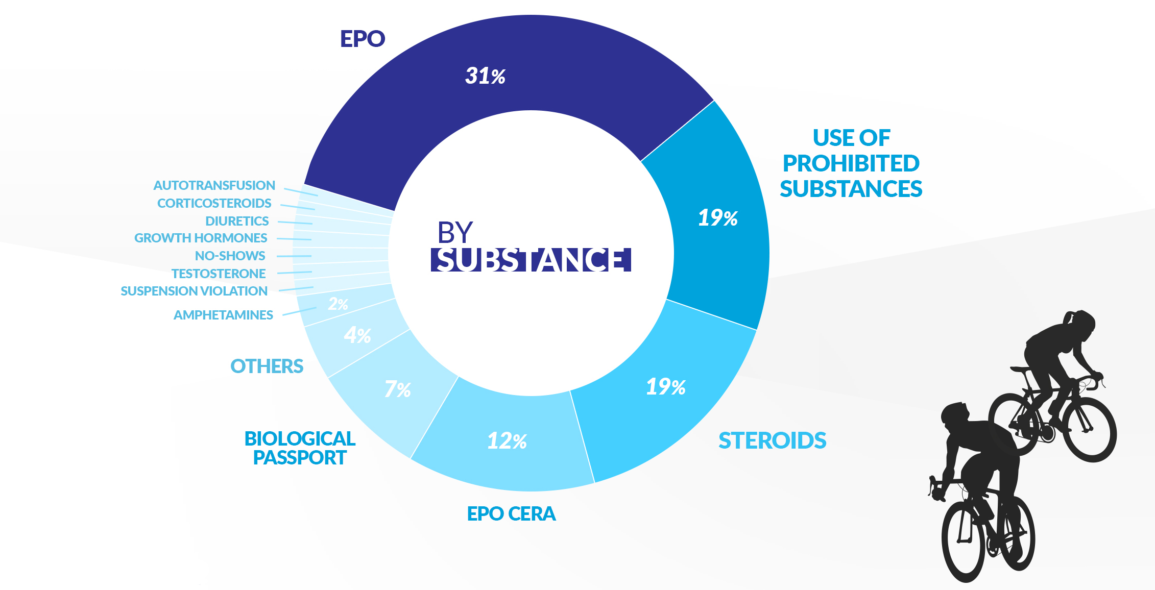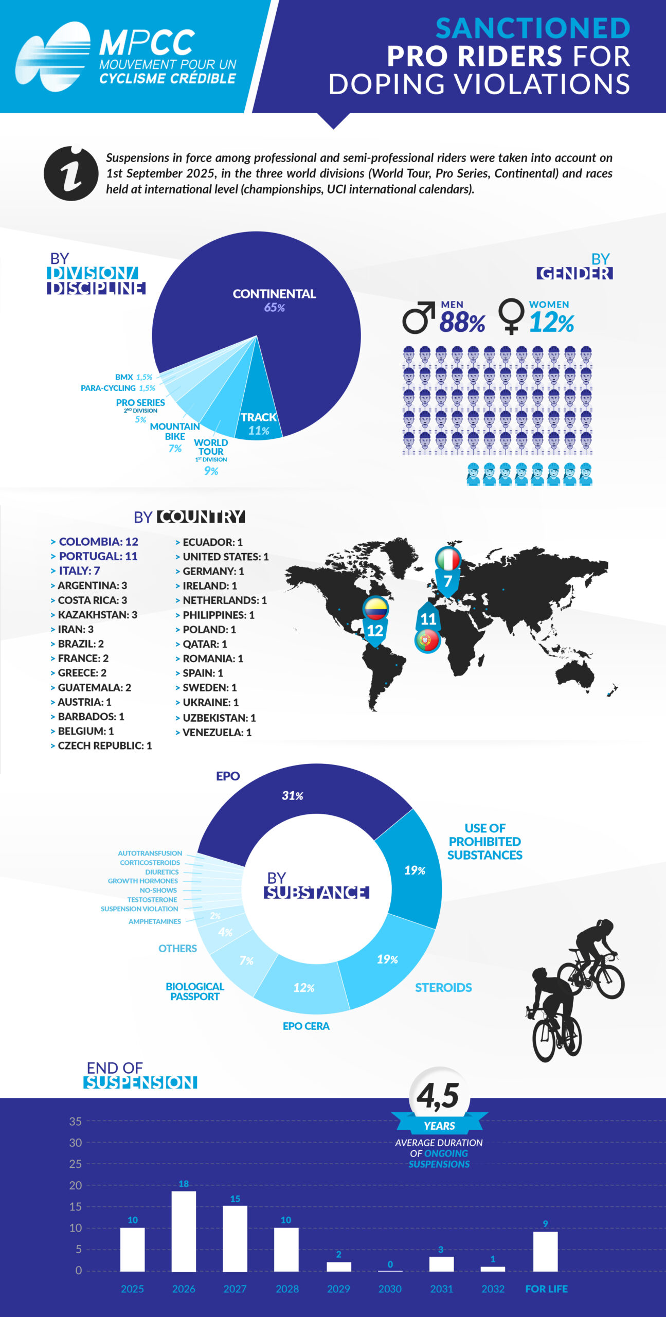 Intended to be an add to the Credibility Figures, this overview of professional athletes suspended to date provides a broad picture of the state of the fight against doping in our sport, worldwide and by discipline. It also illustrates the efforts and actions undertaken by the various institutions responsible for ensuring the credibility of competitions, whether they be national federations or national anti-doping agencies. This inventory is divided into several categories: cases by country, by level of road competition, by discipline, by products detected during testing, by suspension end date, and by gender.