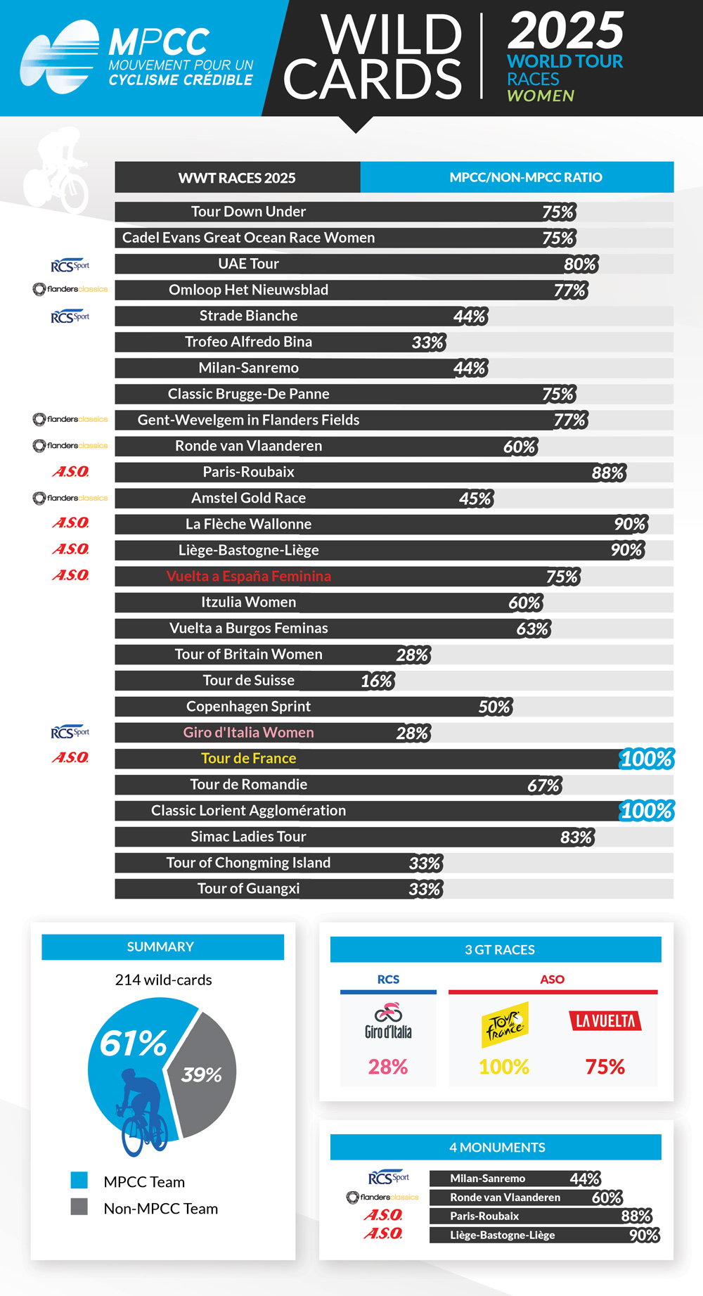 A year ago, the MPCC drew up the situation considering the invitations granted by the organizers of the Women’s World Tour races. In 2024, nearly two-thirds of these wild cards were given to members of our movement. But at the end of the 2025 season, this figure fell slightly to 61%, while the organisation of women’s cycling evolved with the creation of a Pro Team level, set between the elite, the Women’s World Tour, and the traditional Continental level.
