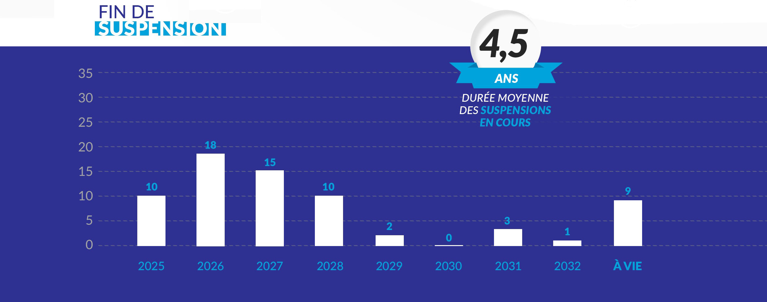 – Le nombre d’athlètes dont la date de fin de suspension est située entre 2026 et 2028 a nettement augmenté par rapport à notre première publication mais du fait de notre méthodologie qui recense les sanctions prononcées, sans les suspensions provisoires. Certains coureurs ont été confondus entre 2022 et 2024 mais n’ont été sanctionnés que récemment, parfois en raison d’une procédure juridique rallongée (recours intentés, analyse de l’échantillon B, contre-expertises, etc.).