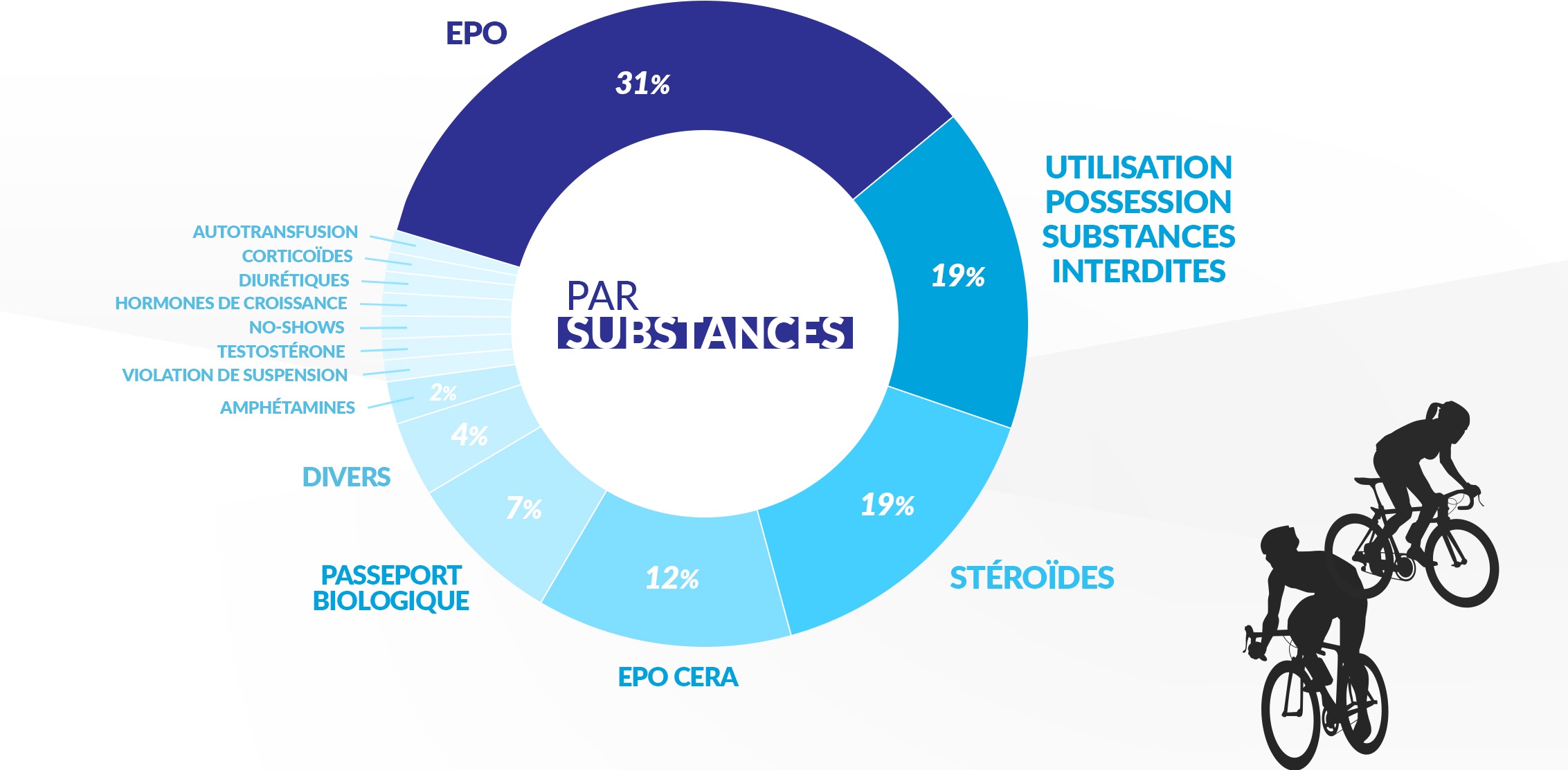 Depuis 2021, les cas de dopage en cyclisme les plus fréquents relevés par le MPCC concernent à la fois des coureurs(ses) de niveau Continental et des contrôles positifs à l’EPO, ou sa variante l’EPO Cera. Cette hormone, que l’on pourrait croire ringardisée un quart de siècle après l’affaire Festina, reste la première cause de suspension chez 43% des athlètes suspendus. Un fait illustre cette tendance : trois des six derniers coureurs professionnels sanctionnés par l’UCI ont été contrôlés positifs à l’EPO, ou à la Cera, et couraient pour des équipes de niveau Continental. L’utilisation de stéroïdes vient en deuxième position des substances détectées dans 19% des cas. Enfin, le terme « utilisation et possession de substances et/ou méthodes interdites » englobe 19% des suspensions en cours mais peut parfois correspondre à une mise en défaut du coureur ou de la coureuse par son passeport biologique, ce dernier ne regroupant officiellement que 7% des sanctions.